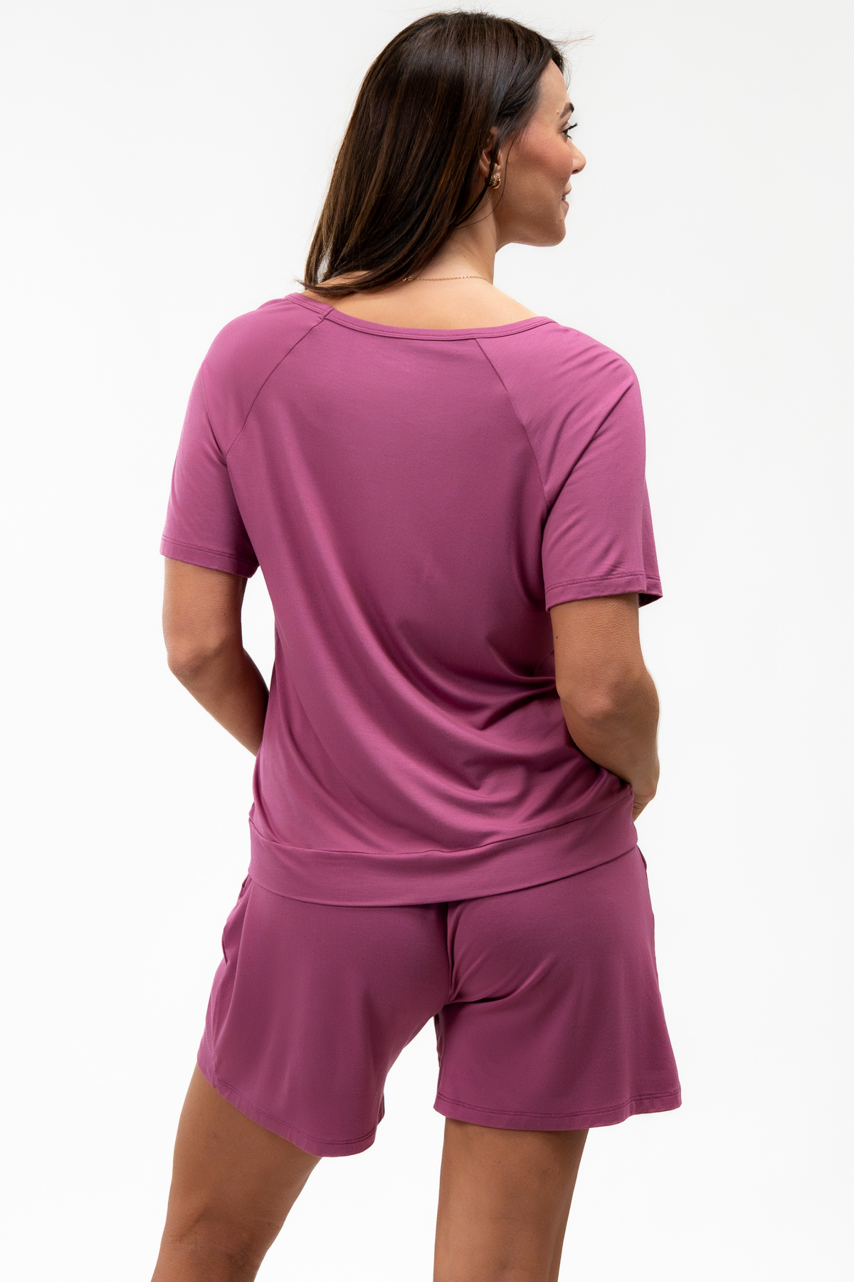 Woman wearing a pink pajama short set on a white background showing the back details