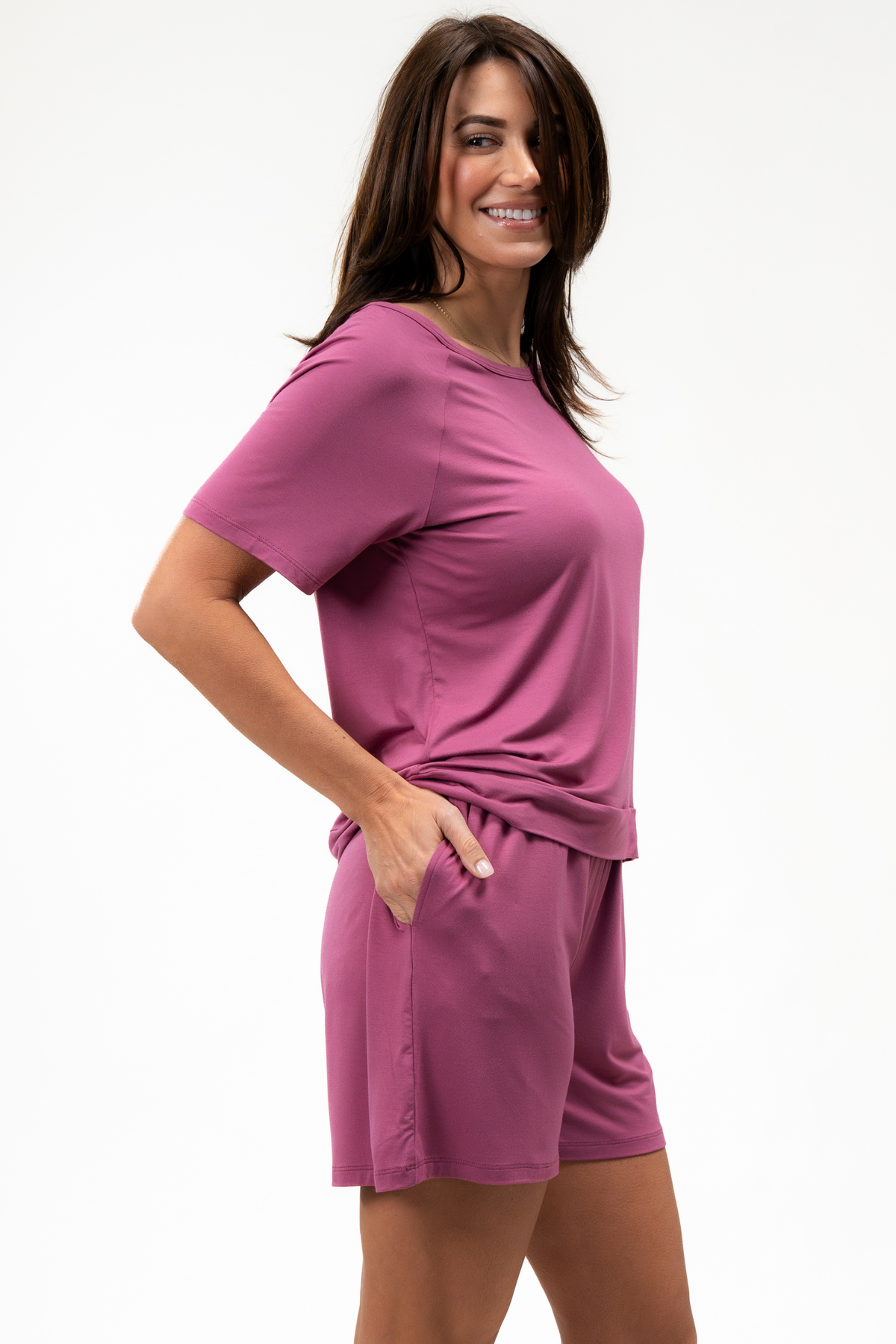 Woman wearing a pink pajama short set on a white background showing the side pockets on the shorts